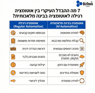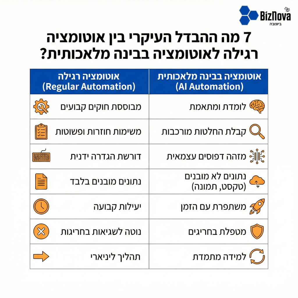 כמישהו שמיישם מערכות אוטומציה ב-BizNova כבר 3 שנים, אני רואה את אותה הבלבול שוב ושוב: "מה ההבדל בין אוטומציה 'רגילה' לאוטומציה עם AI? ואיזו אני צריך?" הנה התשובה הברורה.