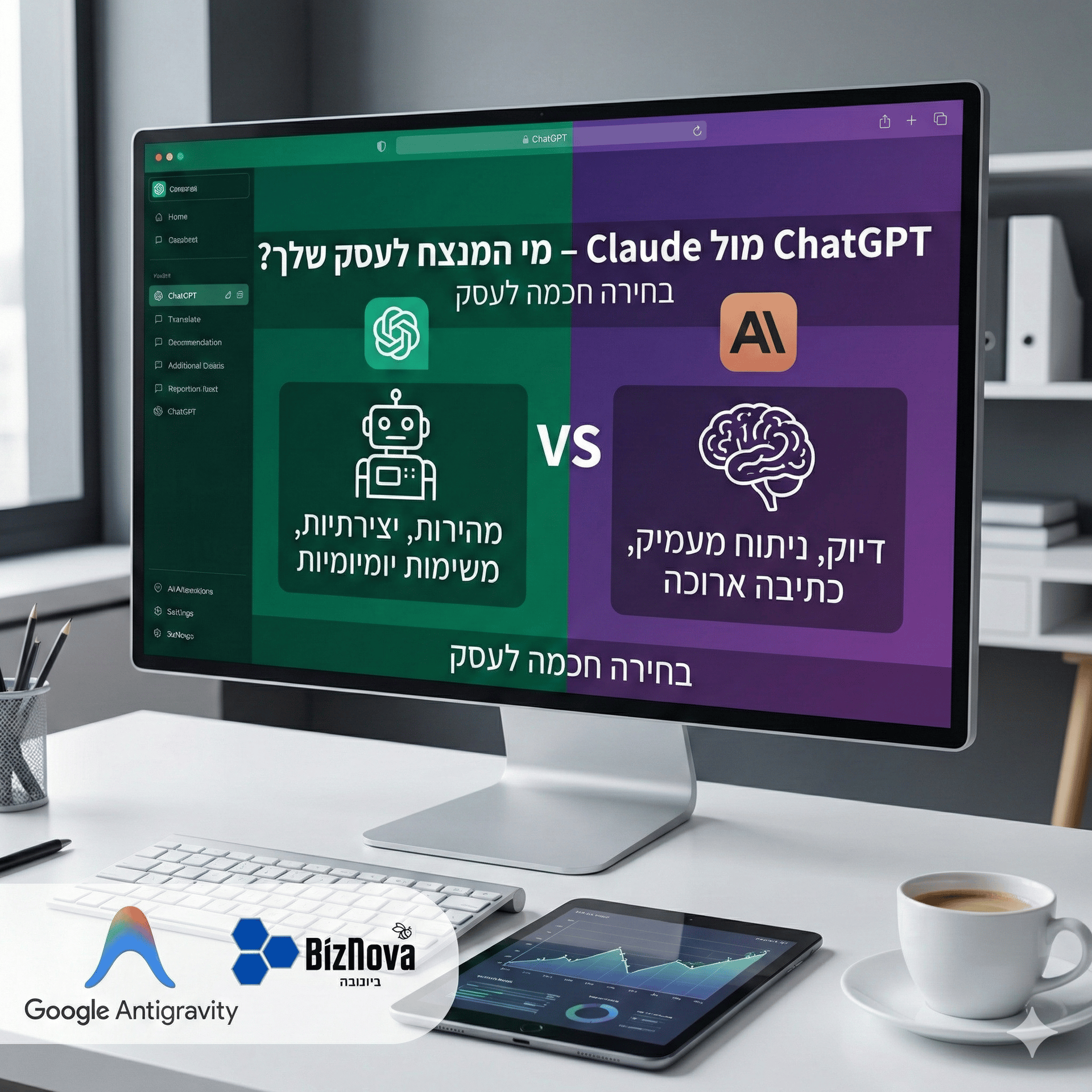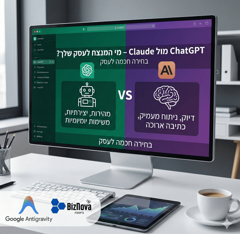 מתלבטים איזה כלי AI ישרת את העסק שלכם טוב יותר? השוואה מעמיקה בין ChatGPT ל-Claude 4.5 Opus. גלו מי מהם כותב עברית טובה יותר ואיזה כלי מנצח בניתוח נתונים עסקיים.